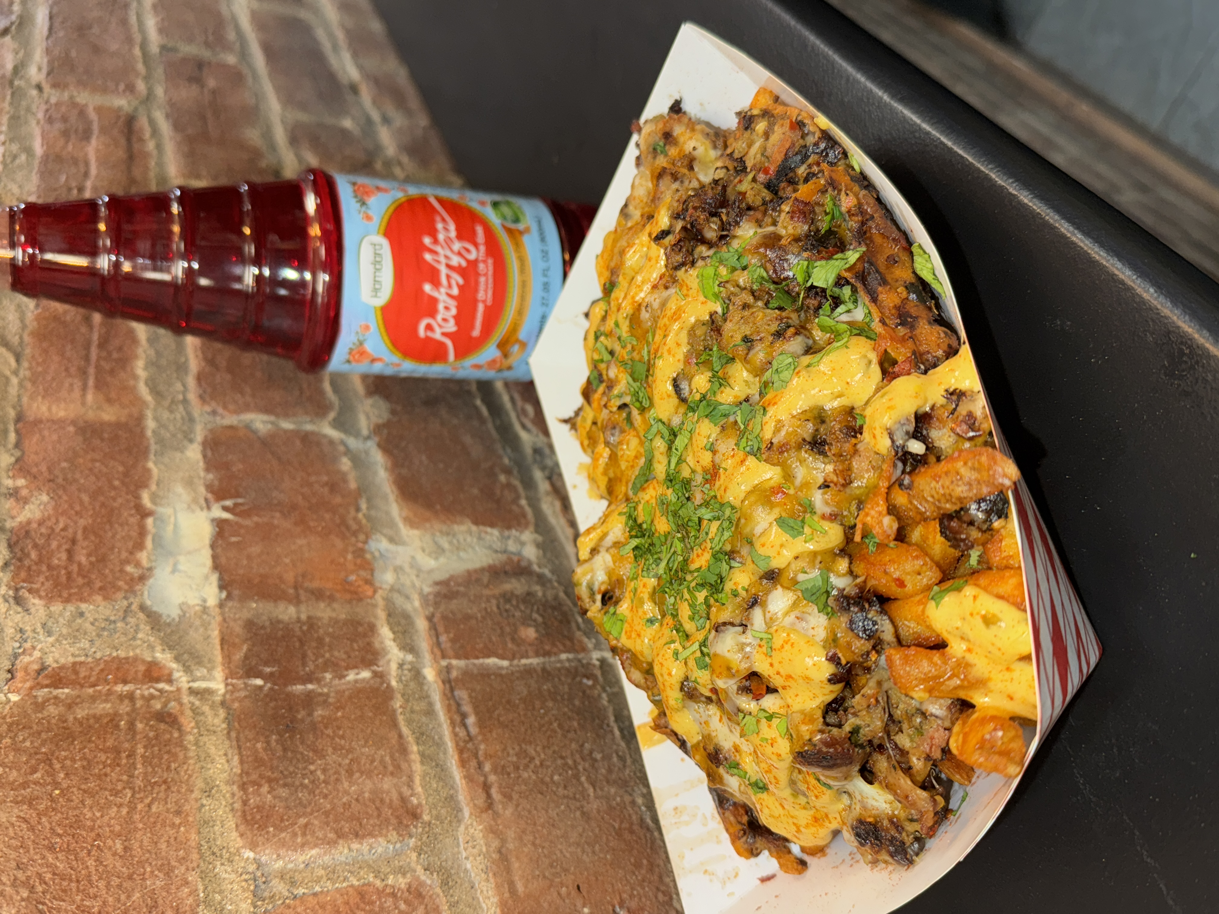 Fries smothered in cheese sauce, chopped beef, and drizzles.
